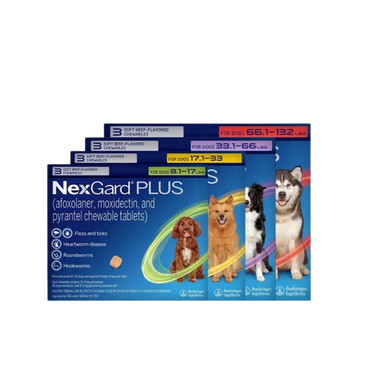 NexGard Plus delivers complete parasite protection in one convenient monthly chew. It protects dogs from fleas and ticks while also preventing heartworm disease and treating common intestinal worms, including roundworms, hookworms, and whipworms. Ideal for pet owners seeking broad-spectrum coverage in a single product.